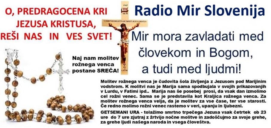 Povabljeni vsi k molitvi rožnega venca od 20. do 22. ure zvečer, ter v nočnem programu katoliškega radia Mir Slovenija ki moli vsaki dan 12 ur rožni venec-e z različnimi molivci . . .