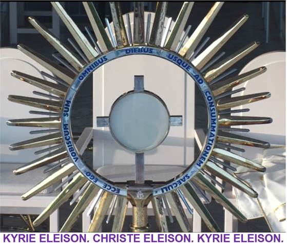 Na Monštranci zgoraj piše Ko iščeš ljubezen, glej Jezusa, glej Jezusa! Kako velika sreča za dušo je dostojno prejeti Boga v svetem obhajilu, v ponižnosti in z živo vero.
